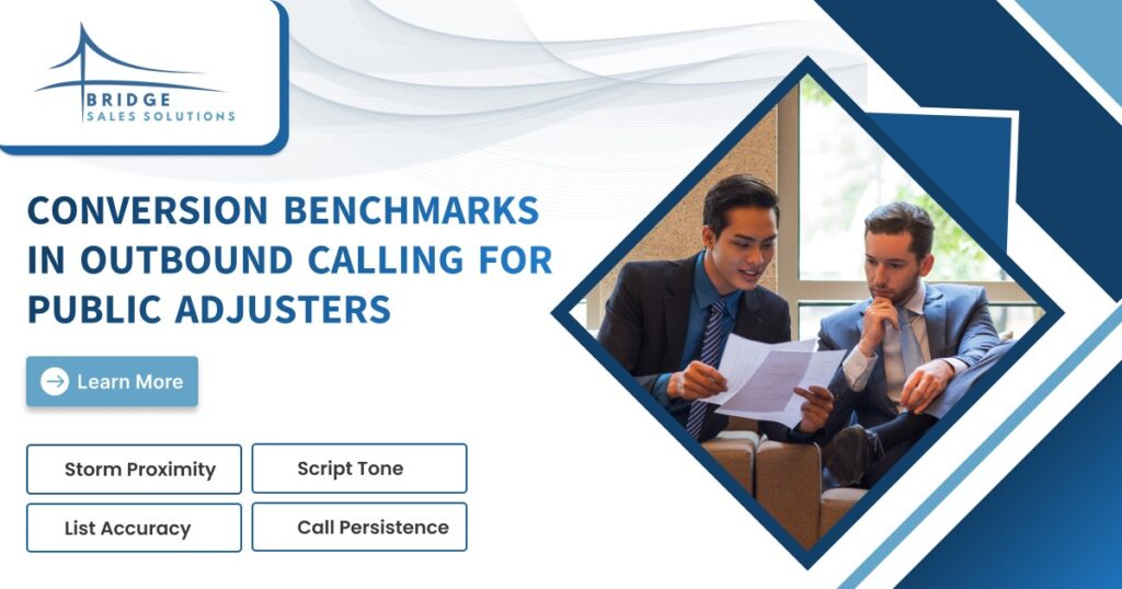 When firms evaluate outbound calling for public adjusters, the first question is usually simple: What’s a good conversion rate? The answer is more nuanced than a single percentage. Conversion benchmarks depend on targeting accuracy, call timing, storm activity, list quality, and follow-up discipline. In the US market where competition increases after every major weather event, […]